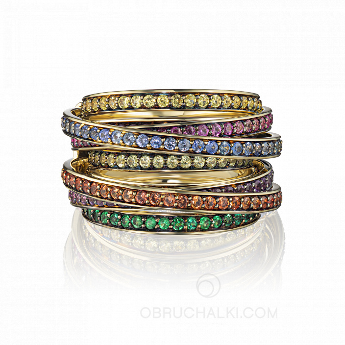 Женское золотое кольцо с разноцветными бриллиантами и драгоценными камнями