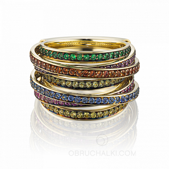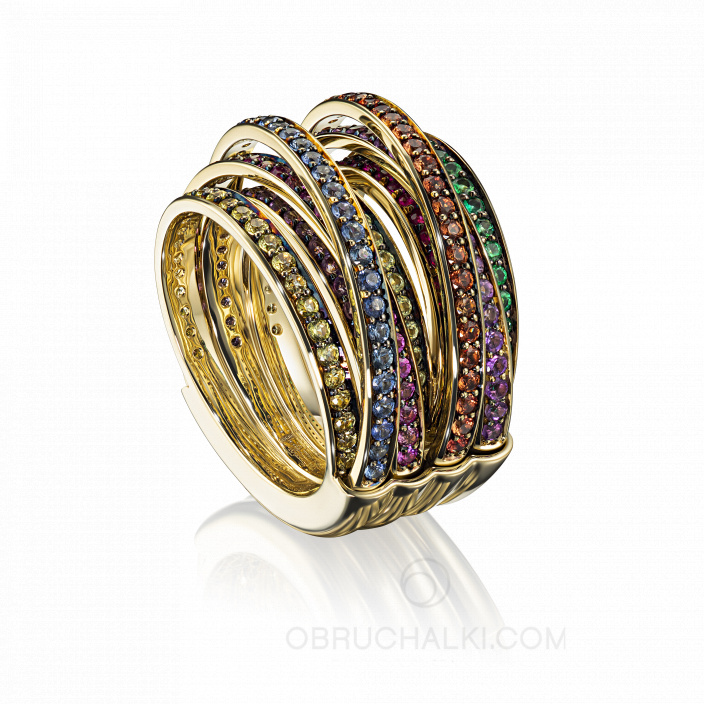 эксклюзивное украшение женское золотое кольцо с разноцветными бриллиантами и драгоценными камнями