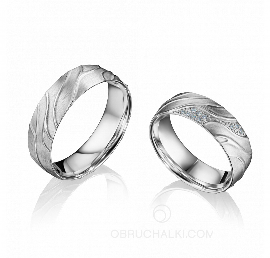 Необычные обручальные кольца с фактурной поверхностью и бриллиантами
