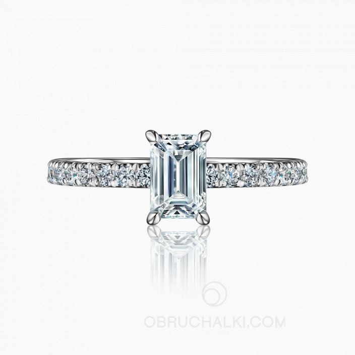 Помолвочное кольцо из белого золота с крупным бриллиантом огранки эмеральд и дорожкой бриллиантов EMERALD AVENUE