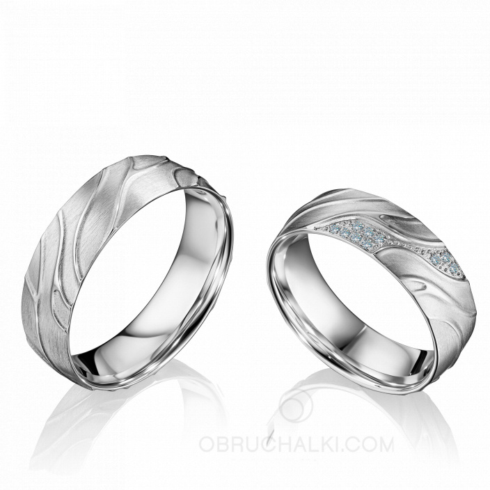 Необычные обручальные кольца с фактурной поверхностью и бриллиантами