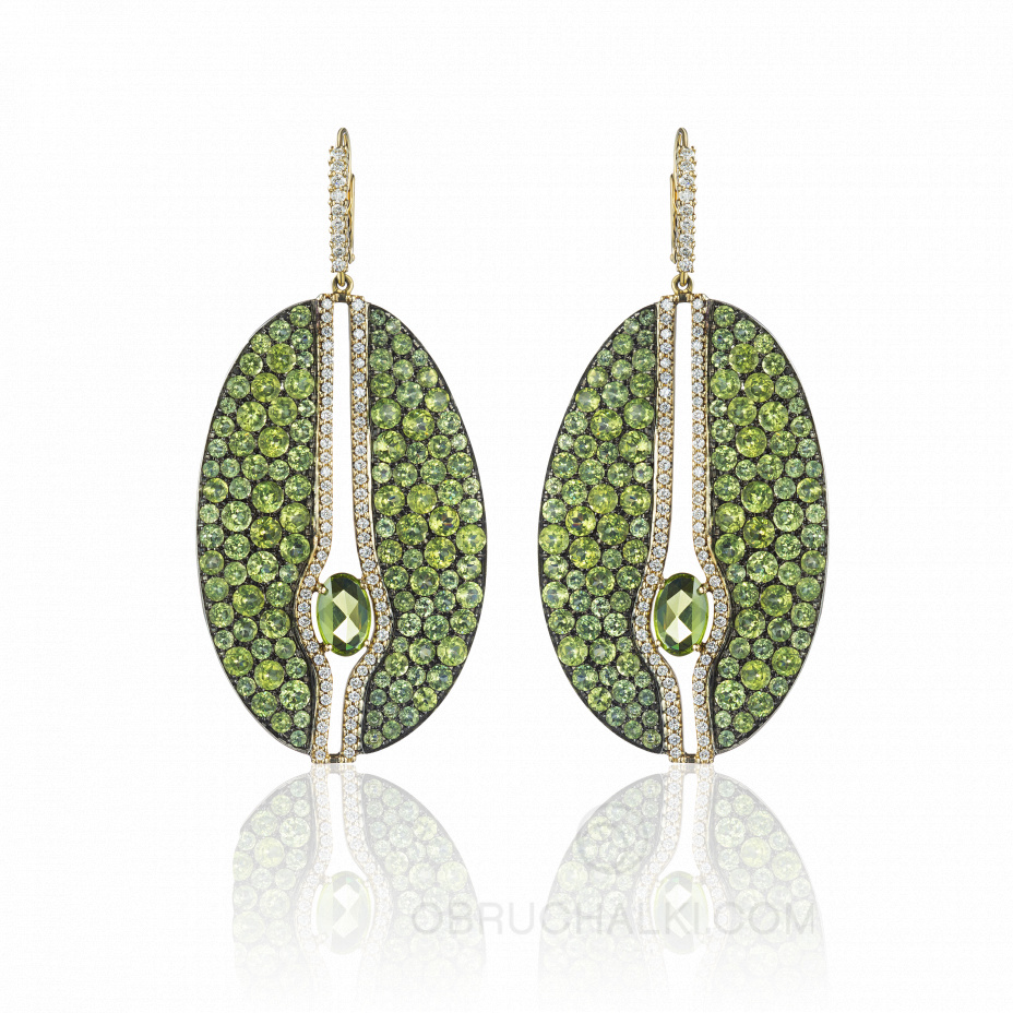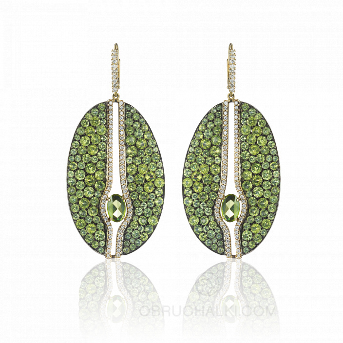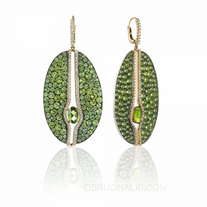 Женские крупные серьги с хризолитами и бриллиантами GREEN RHAPSODY