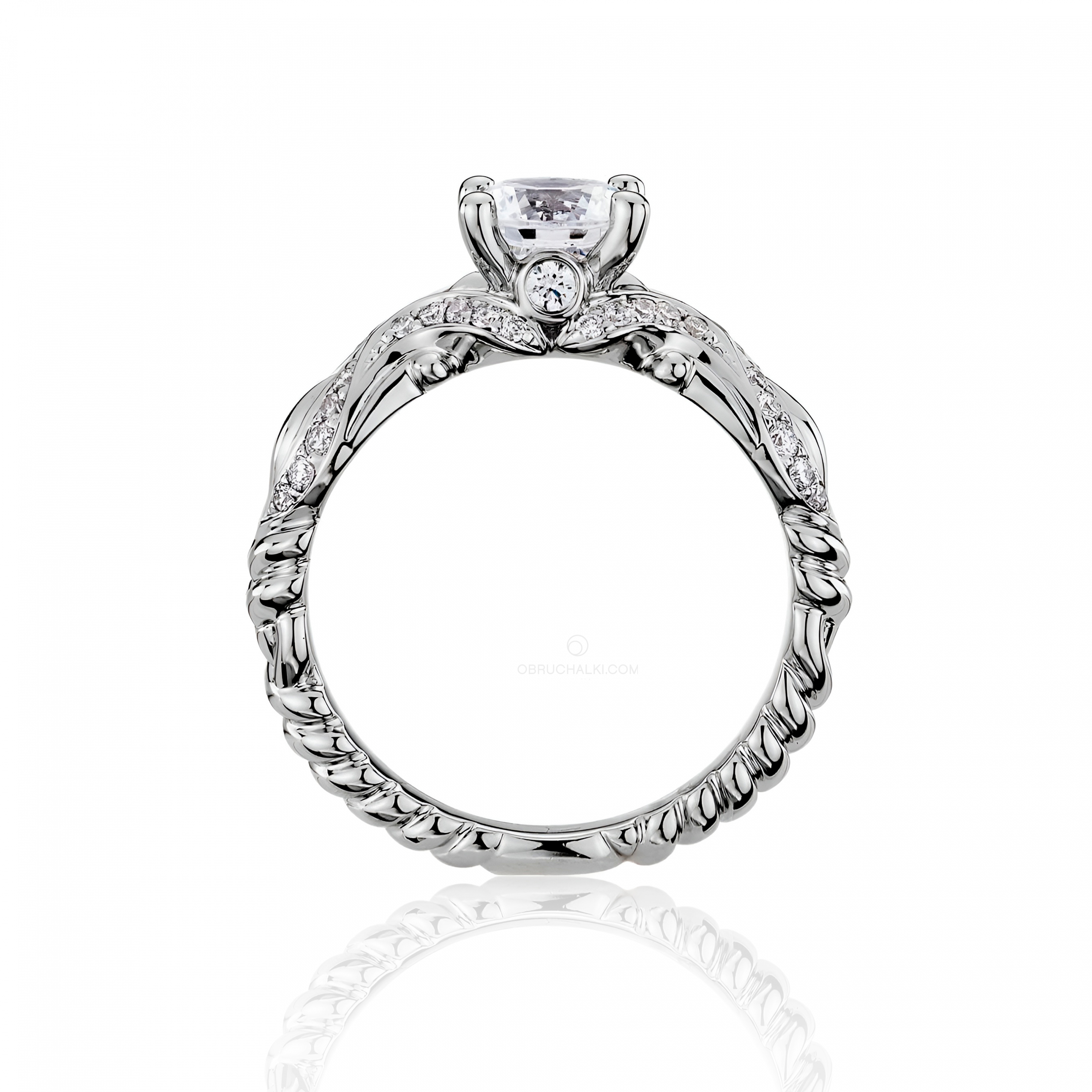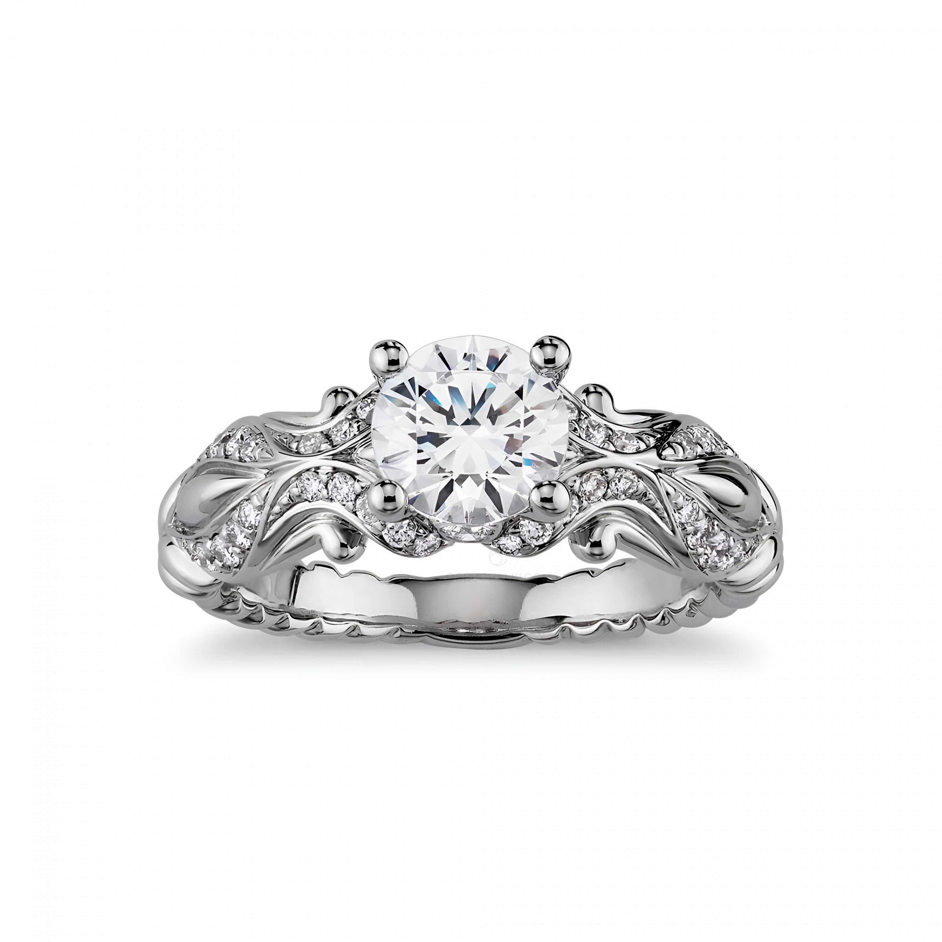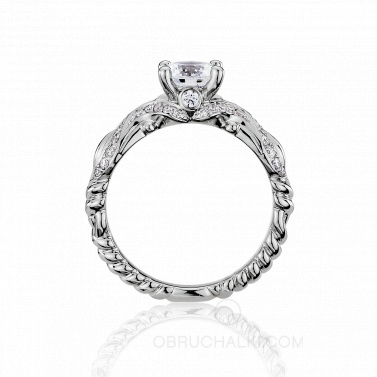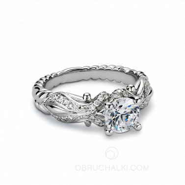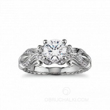 Изящное помолвочное кольцо из белого золота с красивым крупным бриллиантом и растительным орнаментом с бриллиантовой инкрустацией.