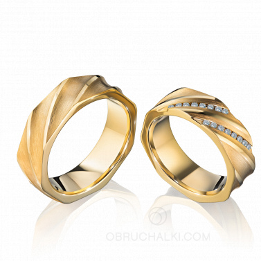 Обручальные кольца из желтого золота с оригинальным узором поверхности, матовой отделкой и бриллиантовыми дорожками. Ширина колец от 5 до 12 мм.