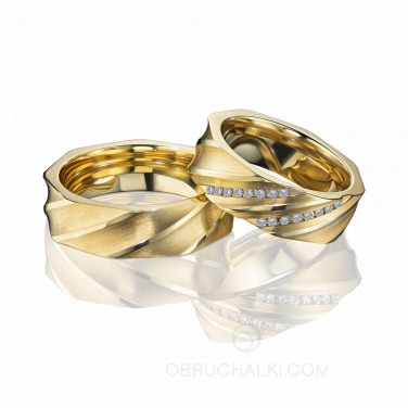 Обручальные кольца из желтого золота с оригинальным узором поверхности, матовой отделкой и бриллиантовыми дорожками. Ширина колец от 5 до 12 мм.