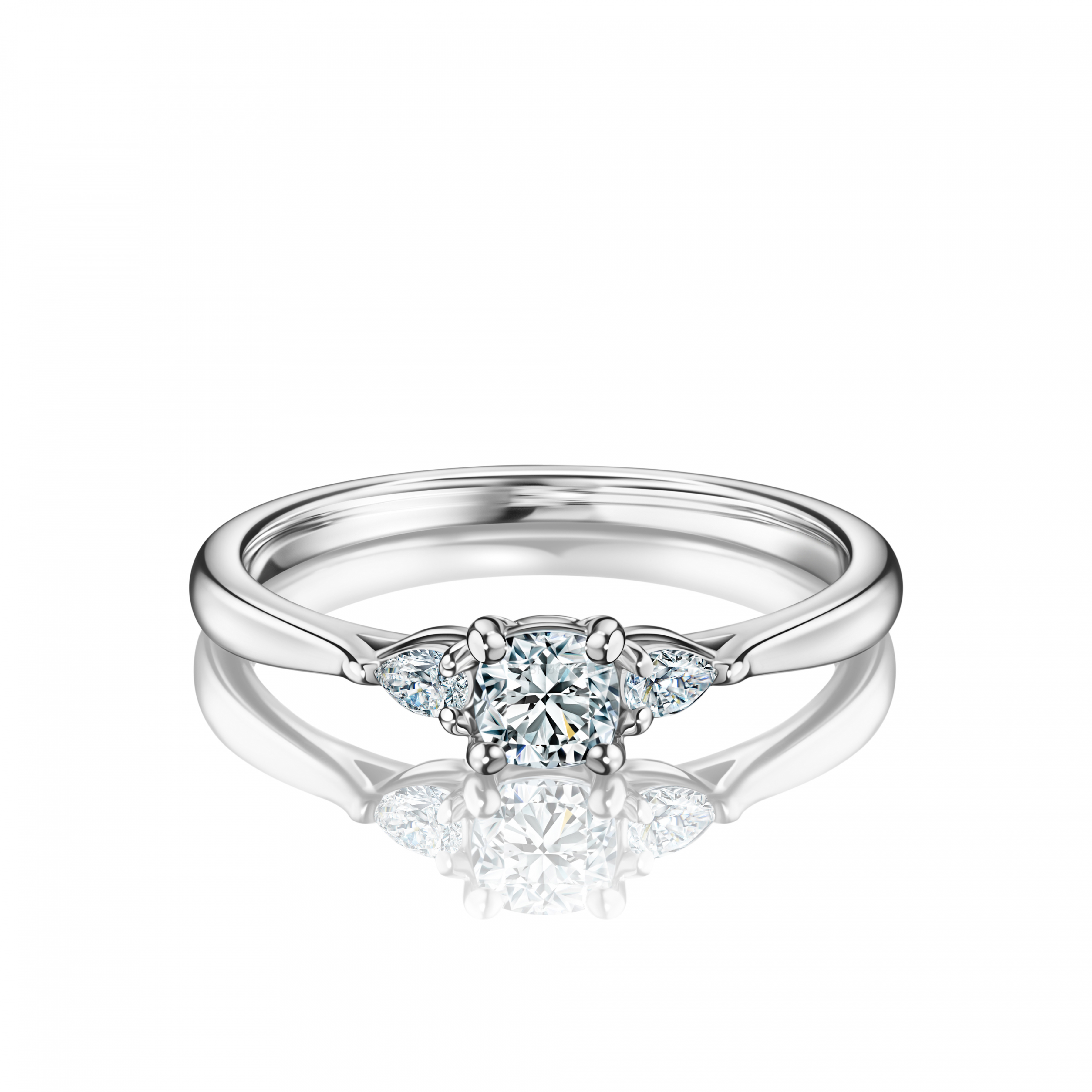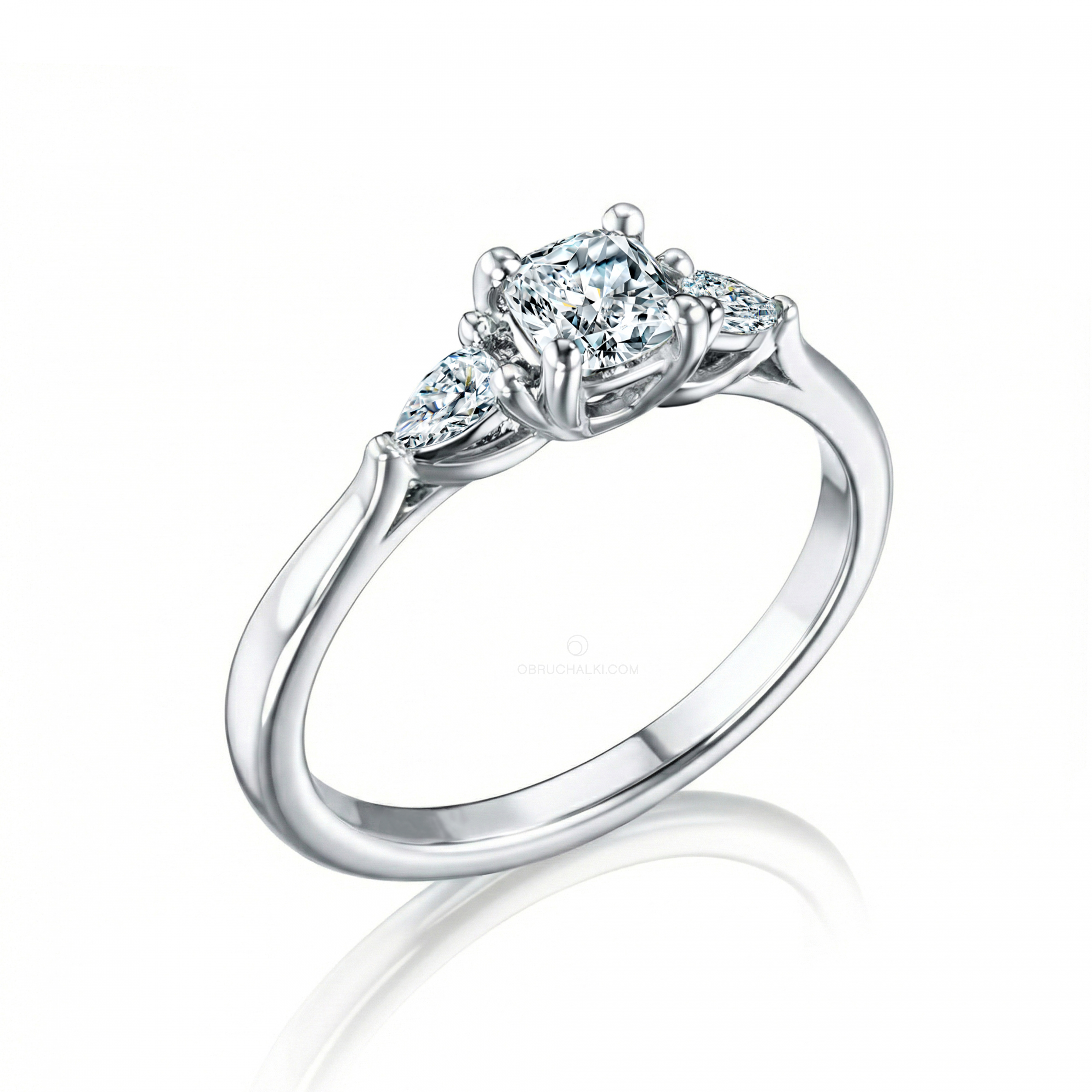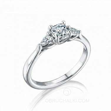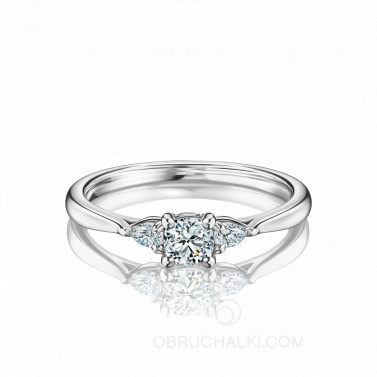 Центральный бриллиант огранки Кушон (0,40 карат) с двумя каплями огранки Груша по 0,07 карат в холодной оправе из белого золота.